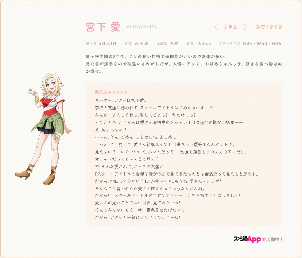 Along with Ayumu Uehara and Rina Tennoji, Ai works with Famitsu App.